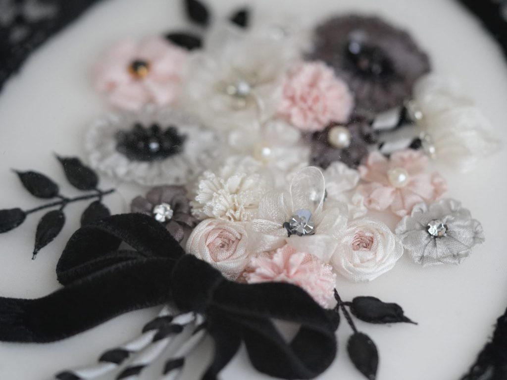 2回目〜8回目のレッスンで、チェーンステッチやキュヴェット(スパンコール)やレースで周りの装飾部分を飾り、リボン刺繍でブーケを刺します。