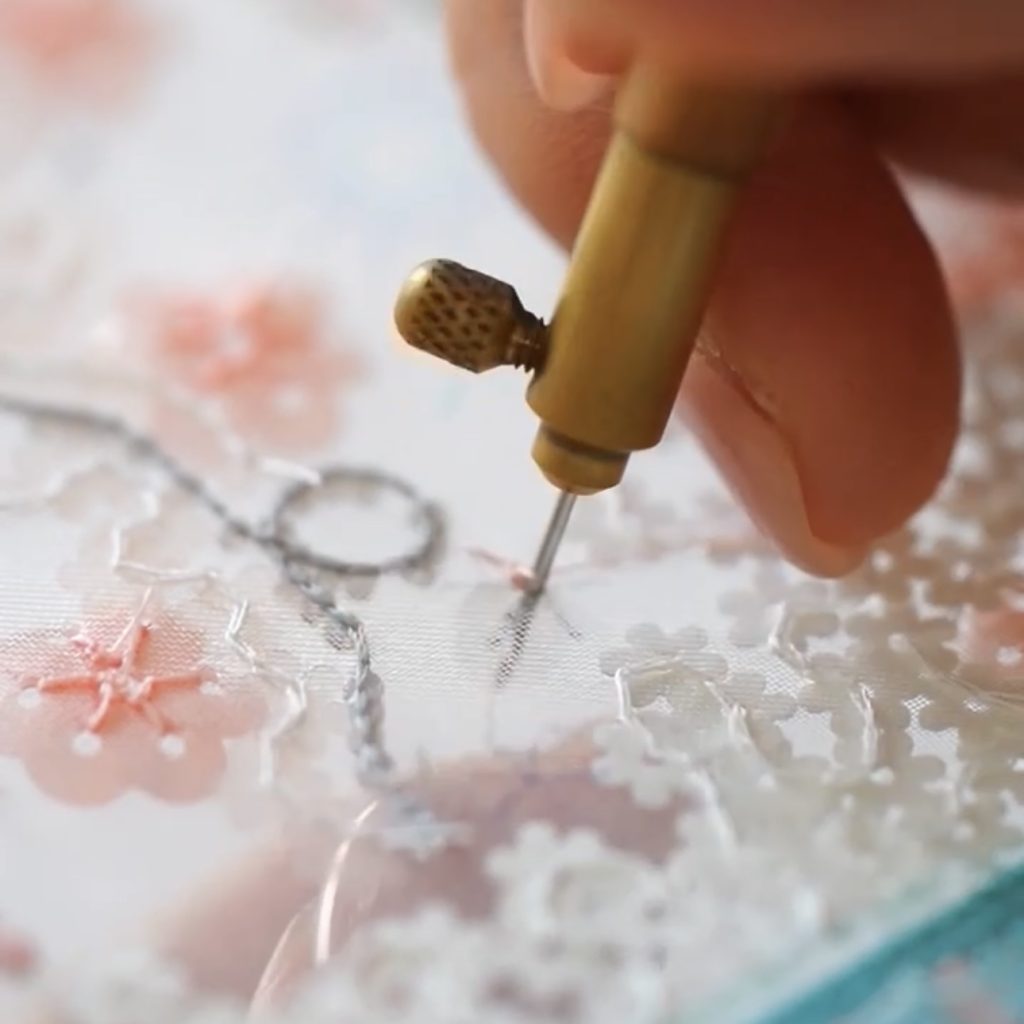 まずは、刺繍枠のオーガンジーの張り方、リュネヴィル技法の基礎、リボン刺繍の基礎を学びながらブーケのデザインの作品を8回レッスンで制作します。