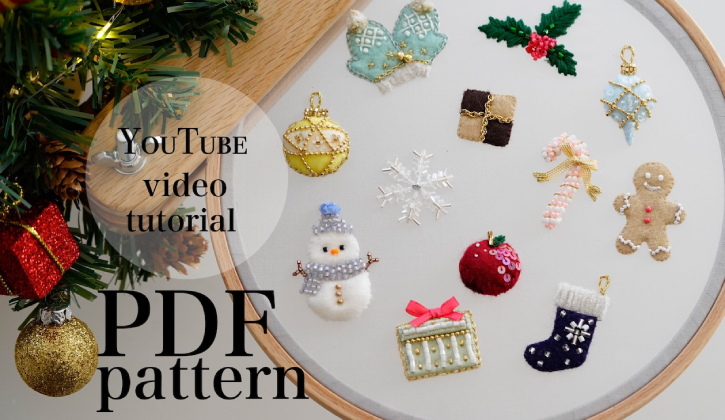 フェルトで作るクリスマスオーナメント、12種の刺繍です。