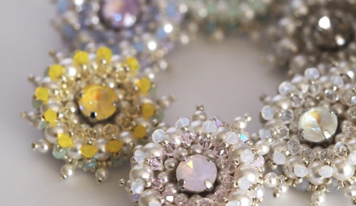 キラキラと輝く星空をイメージしたデザインで、淡水パールやメタルビーズを使った繊細な作品です。
