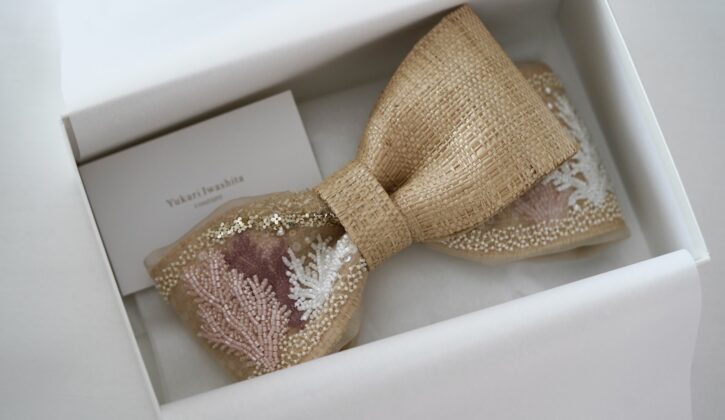 夏らしい珊瑚のモチーフをデザインしました。刺繍を施したラフィア素材の上に刺繍をしたオーガンジーを重ねています。